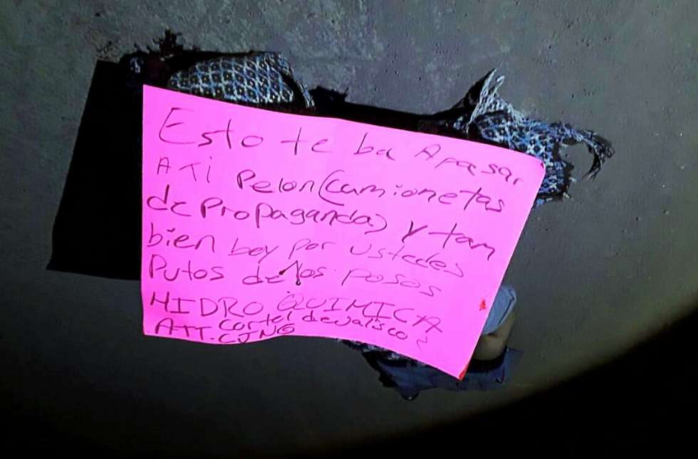 Encima del cuerpo dejaron un mensaje que a la letra decía: esto te ba pasar a ti pelón (camionetas de propagandas) y también boy por ustedes de los posos. HIDRO QUIMICA. ATT Cartel de Jalisco. CJNG.