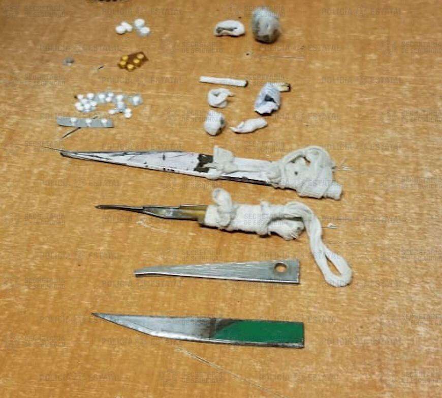 Como resultado de la inspección sorpresiva, emprendida la madrugada de hoy, efectivos de la Secretaría de Seguridad (SS) localizaron ocho envoltorios de una hierba similar a la marihuana, además de 30 pastillas, así como cuatro pedazos de metal con punta de diferentes medidas.
