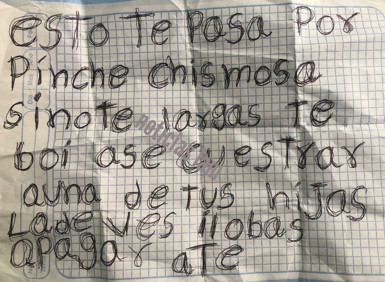 Una vez que cesó la balacera, salieron y localizaron un papel con amenazas que decía: "Esto te pasa por pinche chismosa si no te largas te boi a secuestrar a una de tus hijas la deves i lo vas a pagar ate".