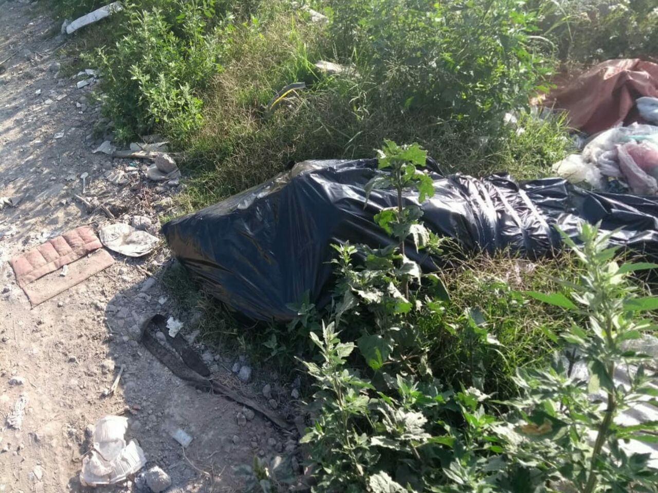 Al pasar, junto a un predio baldío, se percataron que de entre los matorrales y la hierba crecida, se encontraba una un bulto con forma de ser humano, envuelto en polietileno que fue abandonado entre la basura.