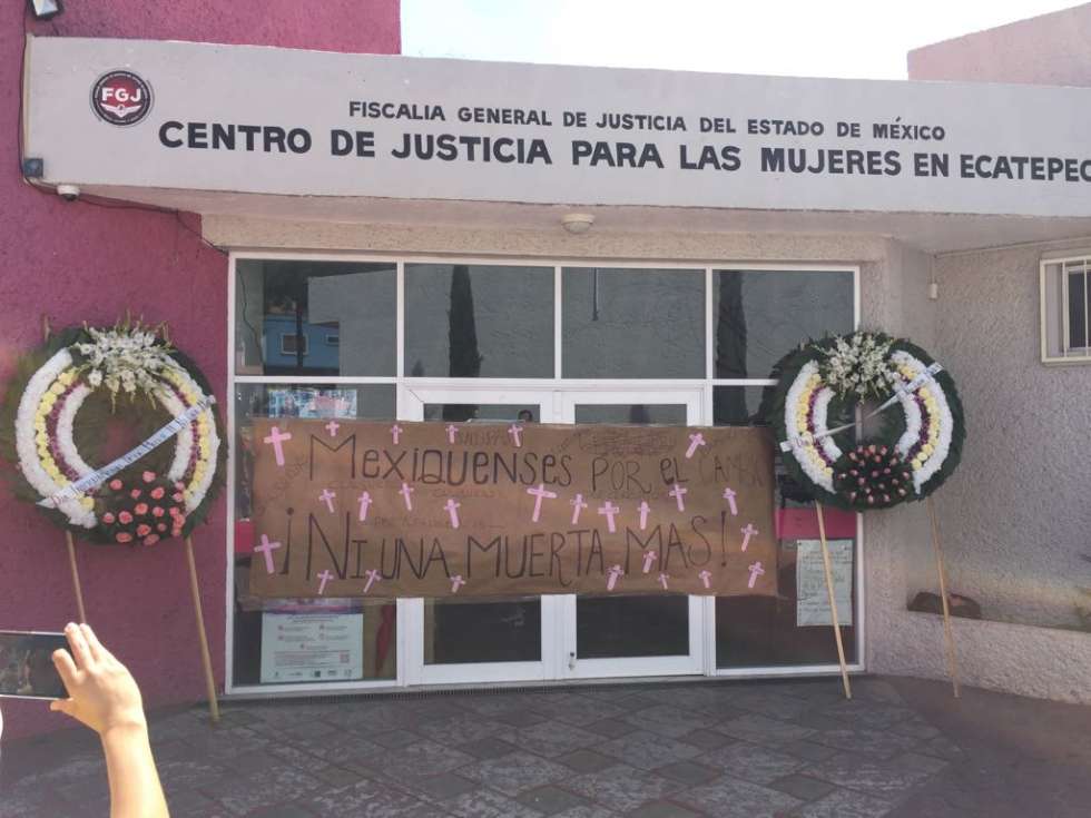 Con pancartas en las que se leía: “Ni una muerta más”, “Queremos Justicia” y “No más Feminicidios” y algunas cruces color rosa; las mujeres arribaron a las instalaciones del Centro de Justicia Para las Mujeres en Ecatepec, la cuál clausuraron y en donde colocaron coronas de flores, en señal de luto.