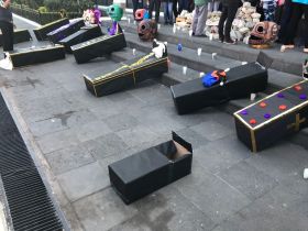 *Los padres de familia colocaron calaveras, féretros y restos de ladrillos en la entrada del palacio, para exigir respuesta y prevenir tragedias en los planteles escolares.