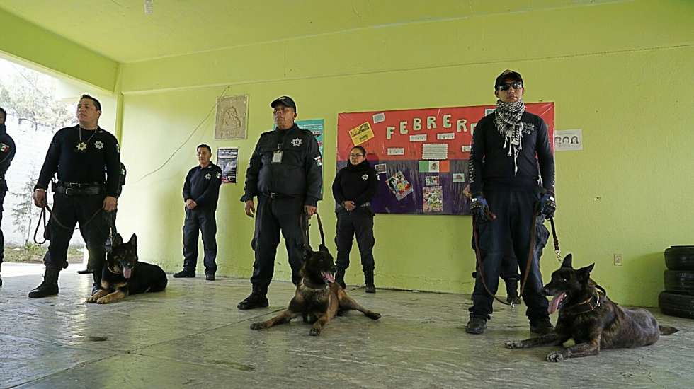 Tezoyuca, Méx, a 14 de febrero.- A petición de directivos escolares y por padres de fanilia, elementos de la policía municipal de este localidad realizaron el operativo Mochila Segura en la Secundaria Belisario Domínguez del Barrio de Santiago, Tezoyuca.