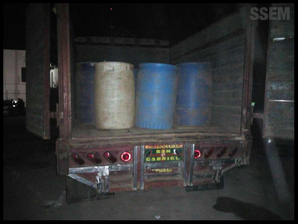 La otra camioneta es una Chevrolet con matrícula de la Ciudad de México y sin reporte de robo, con 12 tambos de 200 litros, 10 de los cuales estaban al 95 por ciento de su capacidad.