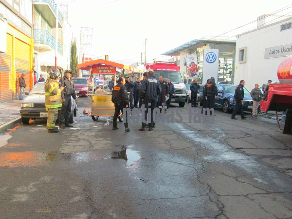 Texcoco, Méx, a 14 de febrero.- Triciclo que transportaba un tanque de gas para vender tacos de birria provocó una fuga dejando un saldo de dos personas lesionadas en calles del centro de Texcoco.