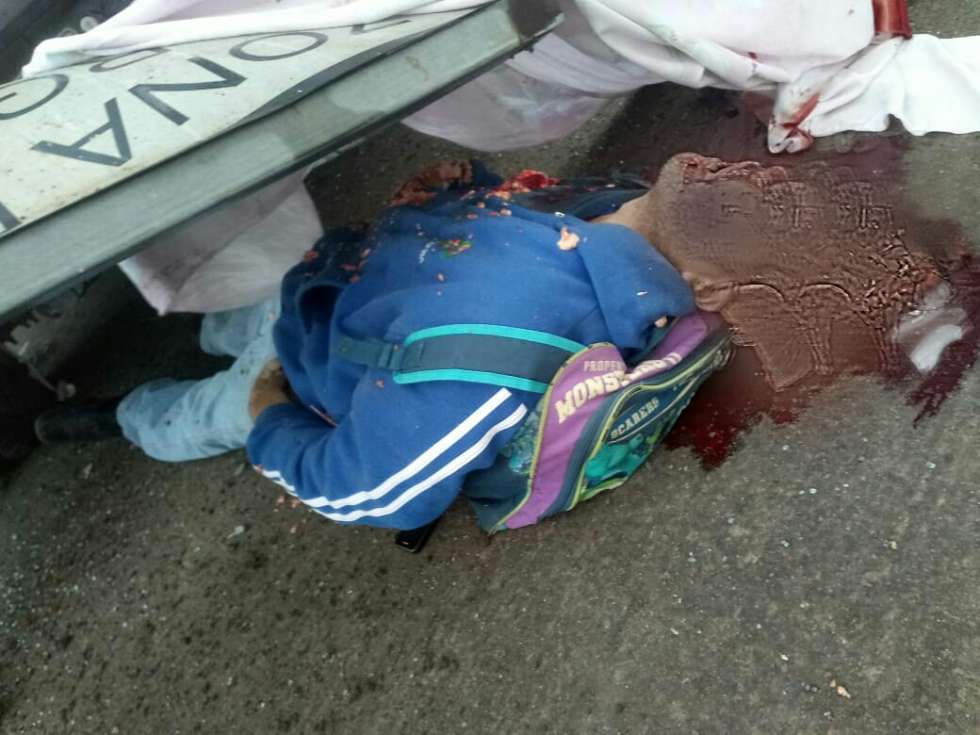 En este lugar se encontraba un letrero vial, mismo que por el impacto fue derrumbado, quedando una persona del sexo masculino entre la unidad y el letrero mismo que se le destrozo la cabeza perdiendo la vida de manera instantánea en el lugar.