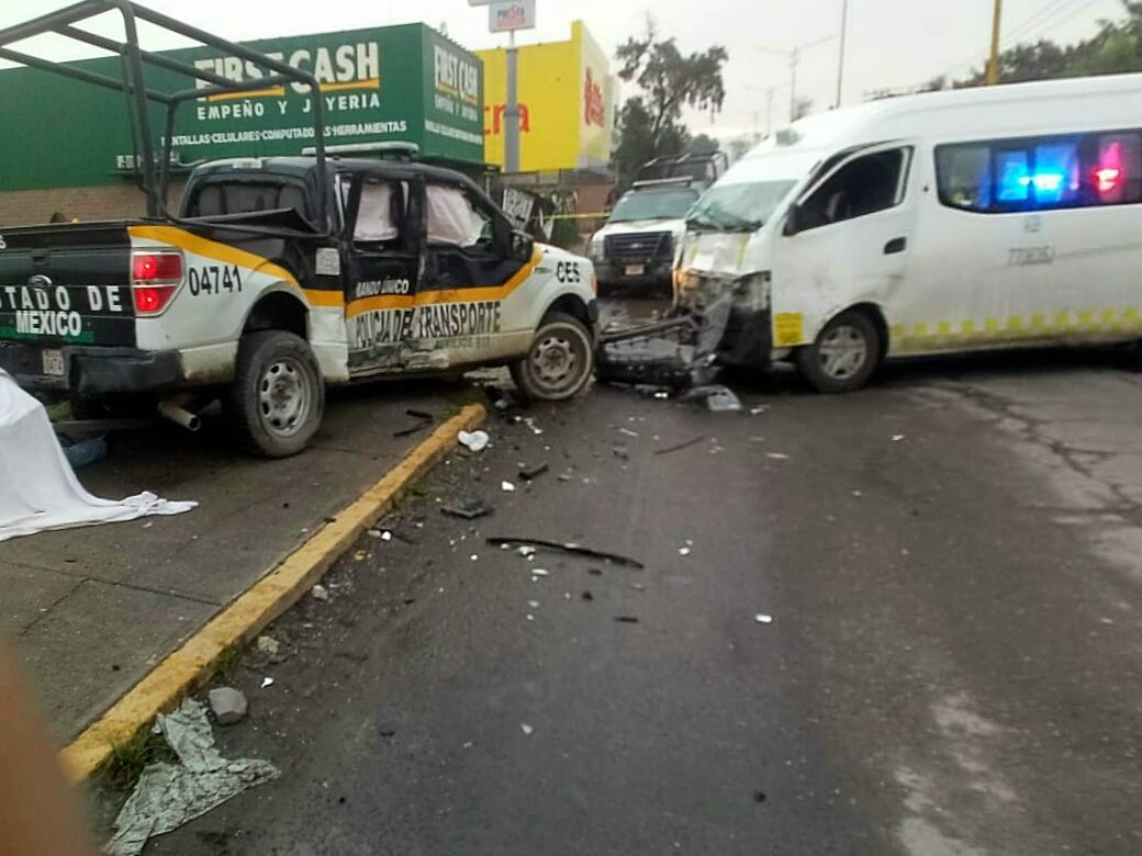 Chicoloapan, Méx 18 de agosto.- Un choque entre una patrulla de grupo de la policía de transporte de la Secretaria de Seguridad del Estado de México (SSEM) y una unidad de transporte público, deja como resultado a una persona muerta.