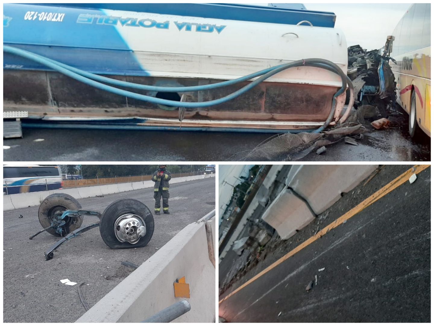 De acuerdo al reporte, una persona que acompañaba al operador de la pipa perdió la vida después de que el automotor se impactó contra el muro de contención y perdió las llantas delanteras que quedaron sobre la carpeta asfáltica.